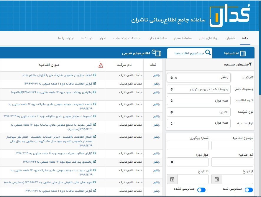 در تصویر بالا، صفحه کدال رانفور را مشاهده می کنید که همواره اطلاعاتی درباره گزارش های شفاف سازی، گزارش اطلاعات با اهمیت گروه الف و ب رانفور، زمان برگزاری مجمع رانفور، زمانبندی پرداخت سود دوره ۱۲ ماهه رانفور، برنامه افزایش سرمایه رانفور و گزارش های حسابرسی شده و حسابرسی نشده در آن اطلاع رسانی می شود.